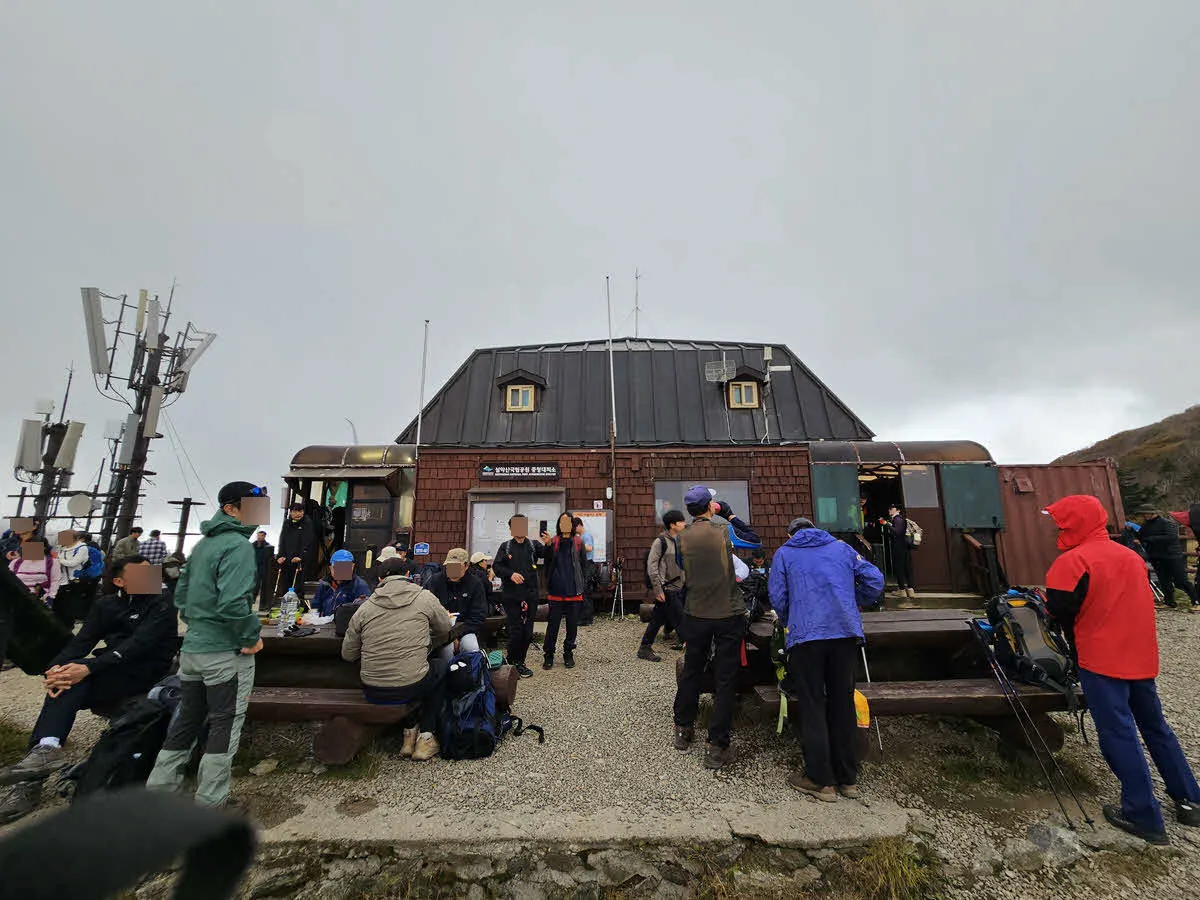 대피소는 사진처럼 이미 인산인해여서 바람을 피해 실내에서 서서 라면과 간식을 먹었다. 에너지를 보충하고 물을(?) 버린다음 바로 대청봉으로 올랐다.