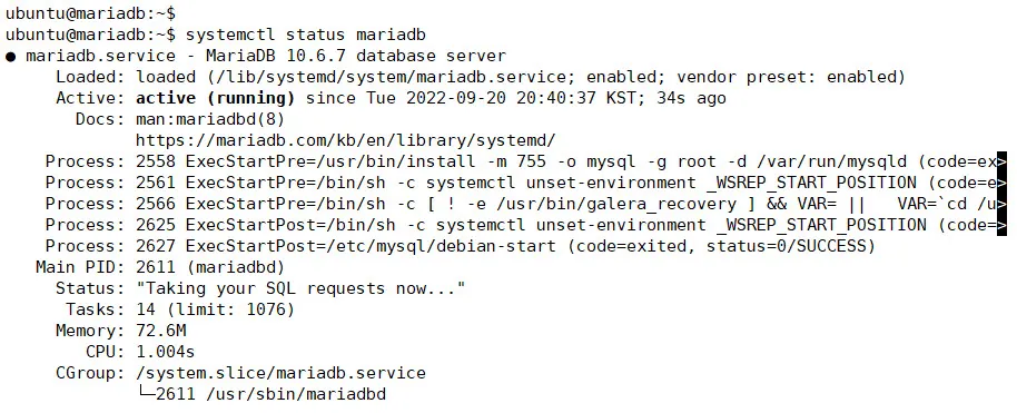 MariaDB 설치 후 상태를 살펴본다. 설치된 버전은 10.6.7 버전이다.