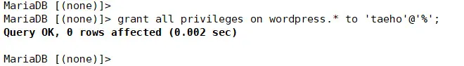 다음은 새로 만든 계정에서 wordpress DB에 접근권한을 부여한다. 귀찮으니 그냥 모든 권한을 준다.