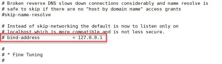 /etc/mysql/mariadb.conf.d/50-server.cnf 파일 또는 /etc/mysql/my.cnf 등에서 bind-address = 127.0.0.1 을 아래와 같이 주석기호인 # 으로 막아붜야 한다.