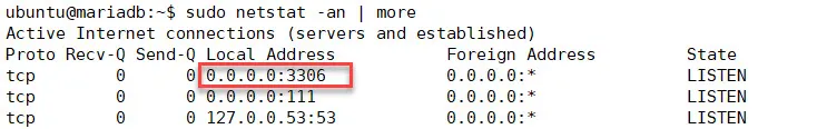 다시 netstat 명령으로 확인해보면 mariadb의 3306 포트가 0.0.0.0 에 바인딩 된 것을 알 수 있다.