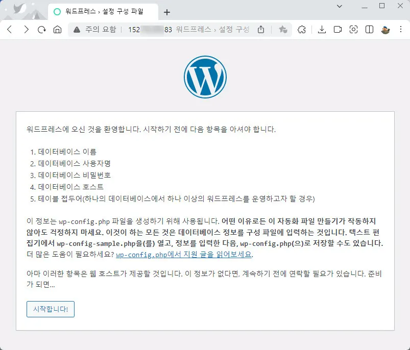 이제 앞의 포스트에서 Apache 2와 PHP를 설치한 웹서버에 워드프레스 설치파일을 업로드 하고 설치 페이지로 접속한다.