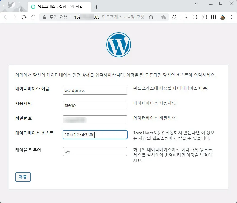 워드프레스 설정 중 가장 핵심적인 화면이다. 앞에서 생성한 데이터베이스 이름(wordpress)과 생성한 계정(taeho)를 입력한다.