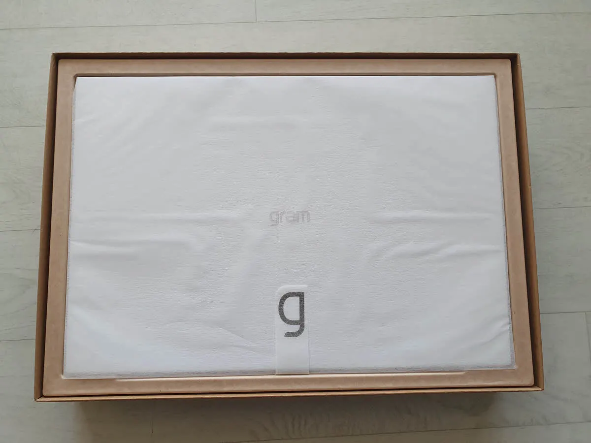 실을 뜯어내고 박스를 열고 만능달력으로 접을 수 있는 골판지를 하나 들어내면 영롱한 하얀색상의 그램 로고가 새겨진 16인치 그램의 넓은 등짝이 모습을 드러낸다.