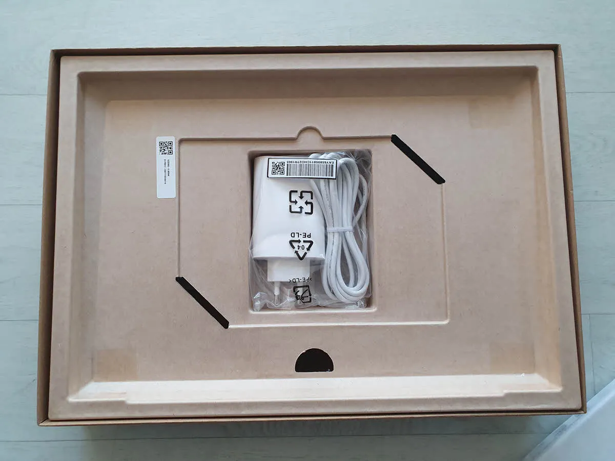 본체를 들어내고 골판지를 또 하나 들어내면 어댑터가 보인다. 요즘 유행(?)하듯 교류전원 케이블 없이 어댑터를 직접 콘센트에 꼽는 형태의 어댑터다. 노트북에 꼽는 부분은 USB C-Type 이다. PD충전 포트에 전원을 연결한다.