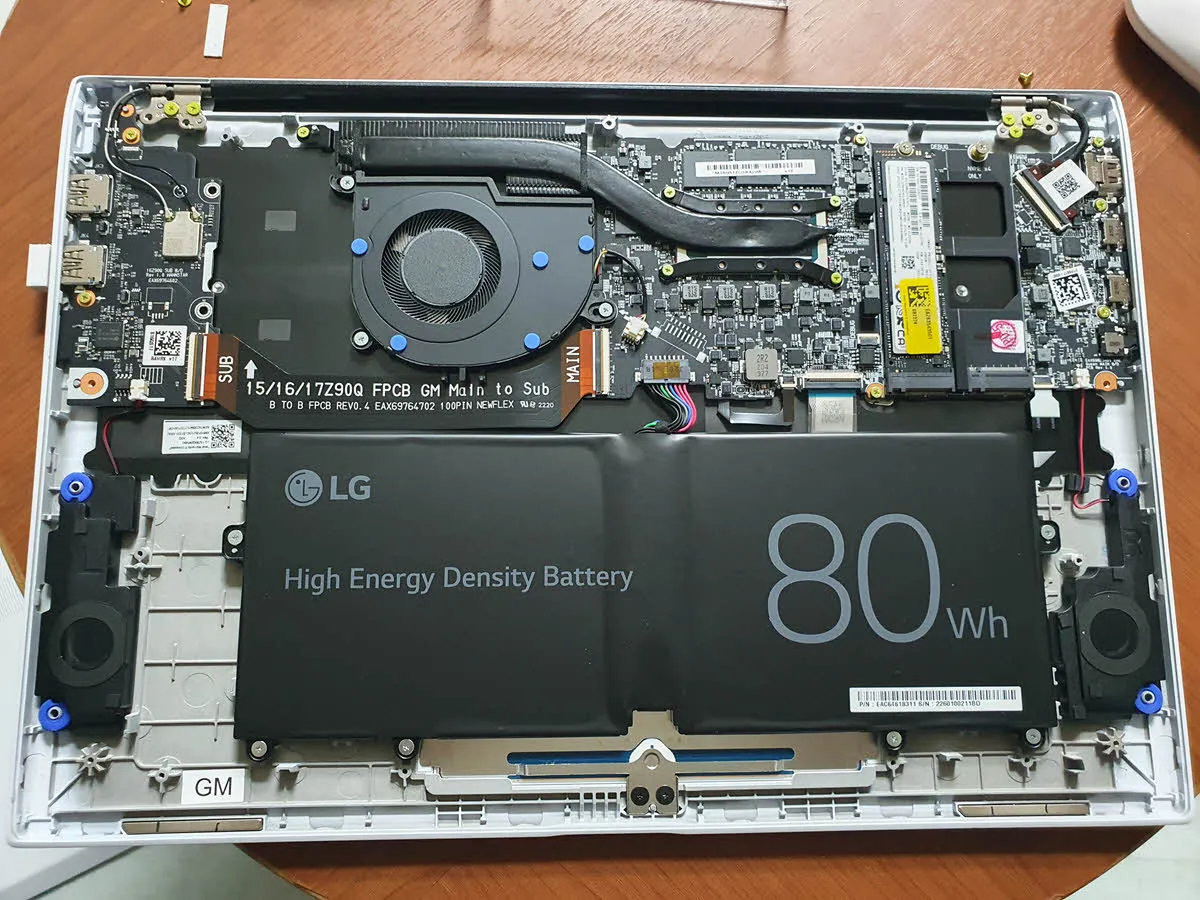 하판을 들어내면 아래 사진과 같이 거대한 배터리와 CPU와 팬이 보이고 오른쪽 상단에 이미 장착되어 있는 256GB SSD 그리고 그옆에 비어 있는 SSD 슬롯이 보인다.