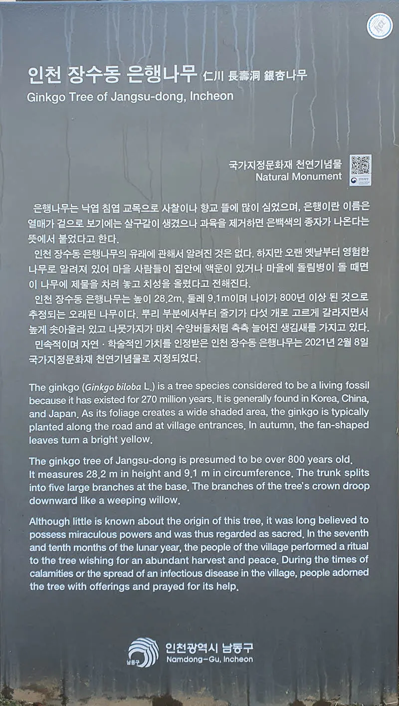인천 장수동 은행나무는 수령이 800년 이상인 것으로 추정되고 높이가 28미터가 넘으며 둘레 또한 9m가 넘는 오래된 은행나무다 게다가 굵은 가지가 5개로 나뉘어 마치 수양버들처럼 축 늘어진 모양을 갖고 있어 자연,학술적으로도 가치를 인정받았다고 한다.