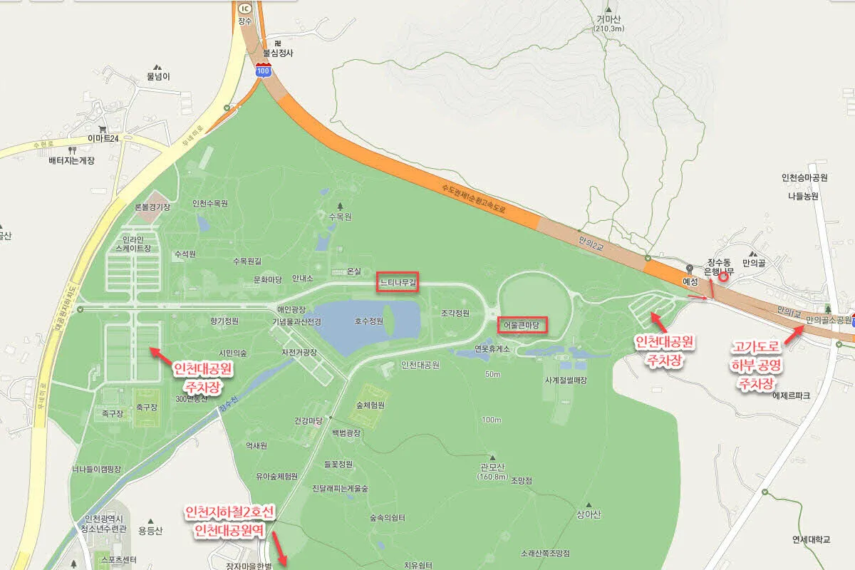 인천 장수동 은행나무는 인천대공원 동쪽 끝자락에 있다. 만의골이라 불리는 동네에 있는 외곽순환 고속도로 하부 공영주차장이나 인천대공원의 주차장을 이용하면 되며 인천지하철 2호선 인천대공원역에서 하차하여 산책삼아 인천대공원을 관통하여 공원길을 걸어가도 좋다.인천대공원 서쪽과 동쪽에 있는 주차장을 이용해도 된다.