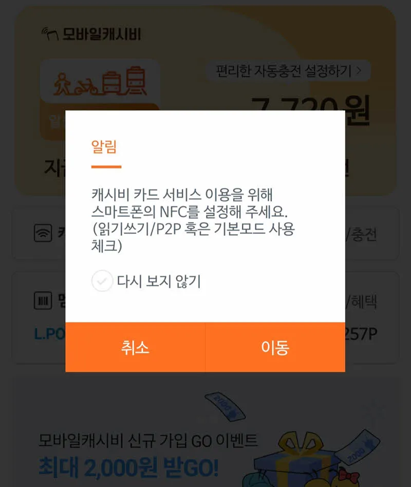 모바일 캐시비 앱의 NFC 설정 (읽기/쓰기 또는 카드모드 설정)