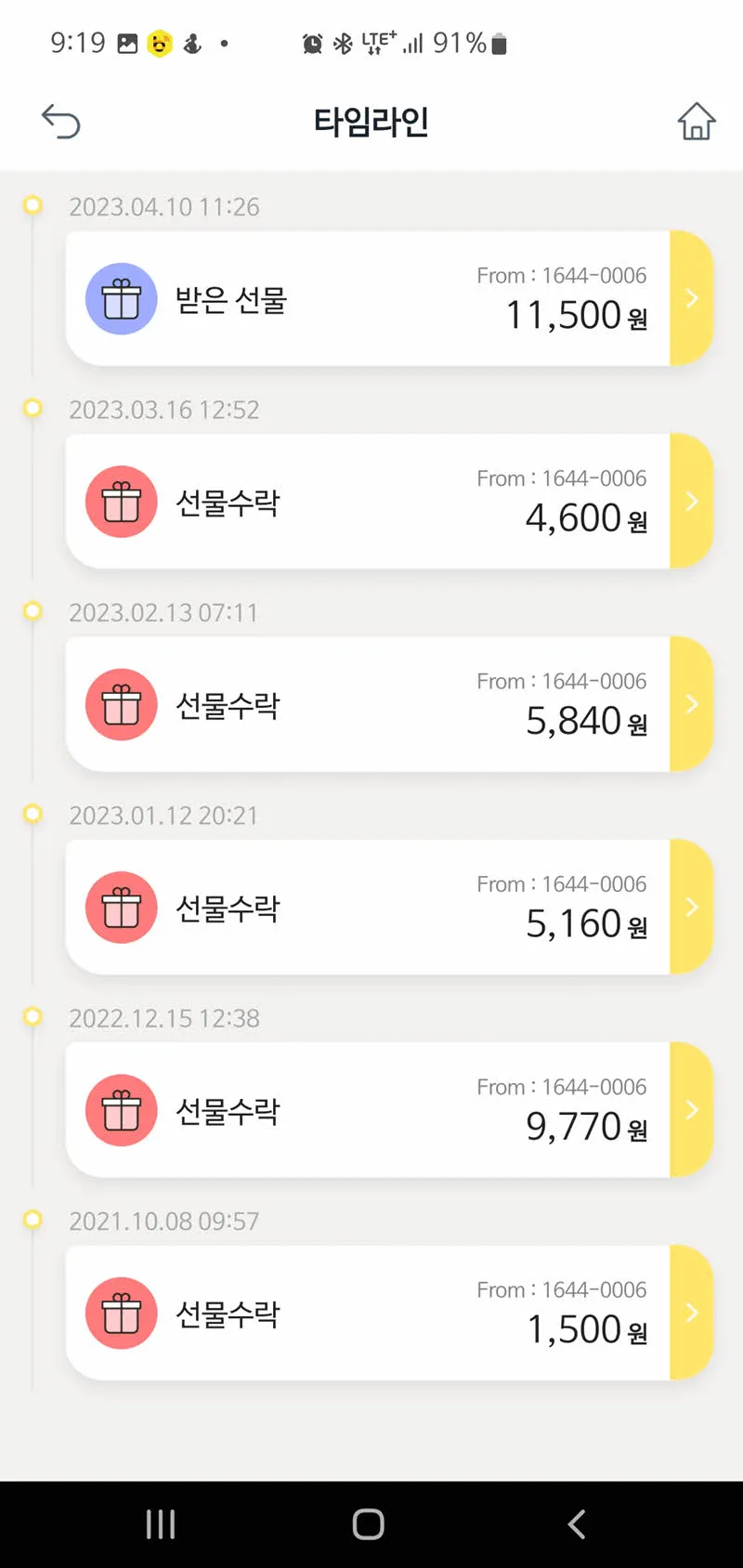 포스팅하기 전날. 마일리지 11,500원이 선물로 지급되었다는 것을 알 수 있다. 매월 적게는 4~5000원이, 많게는 1만원 정도가 지급되고 있음을 알 수 있다.