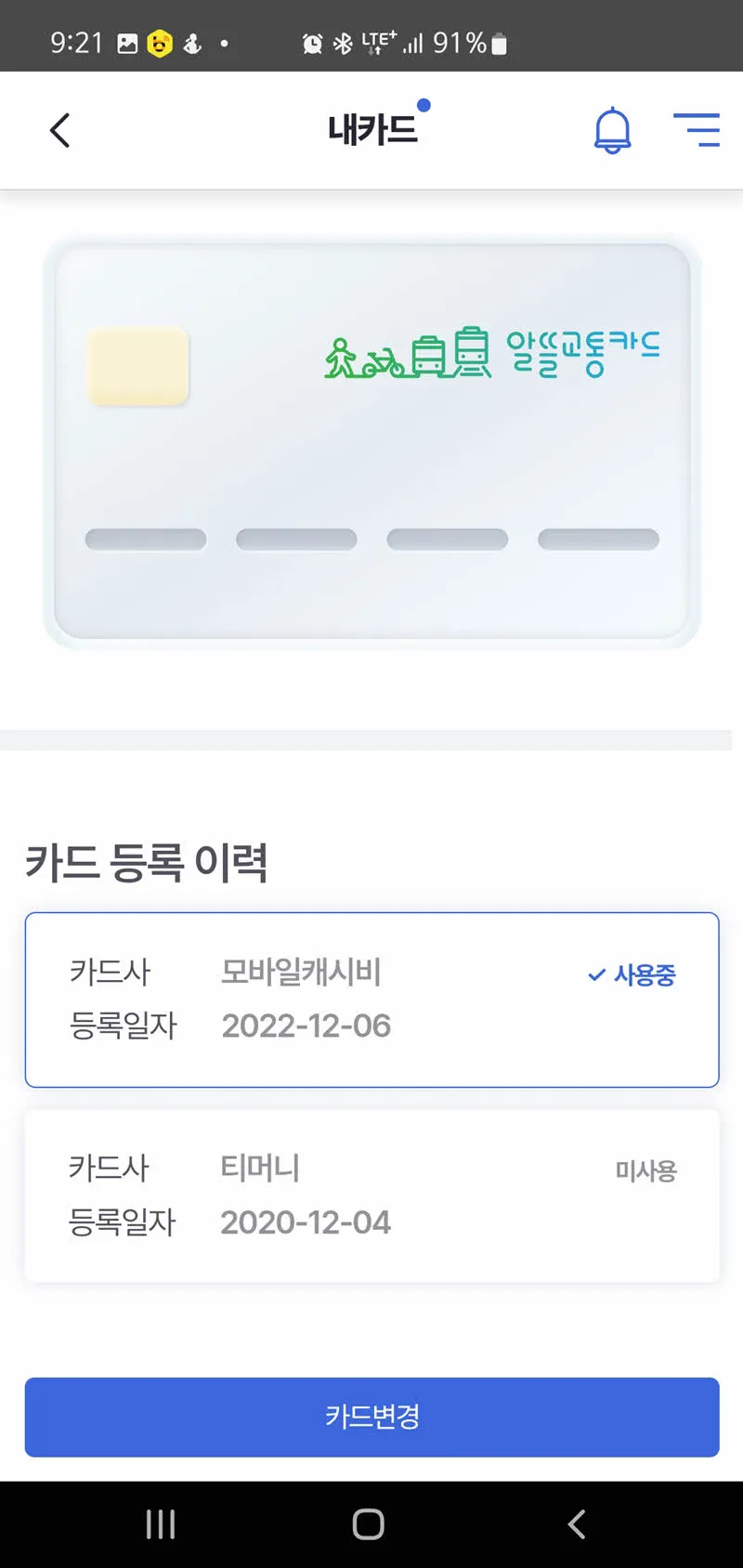 아래 화면을 보면 티머니 카드를 등록했다가 1년 정도 사용하고 모바일 캐시비로 변경한 것을 알 수 있다.