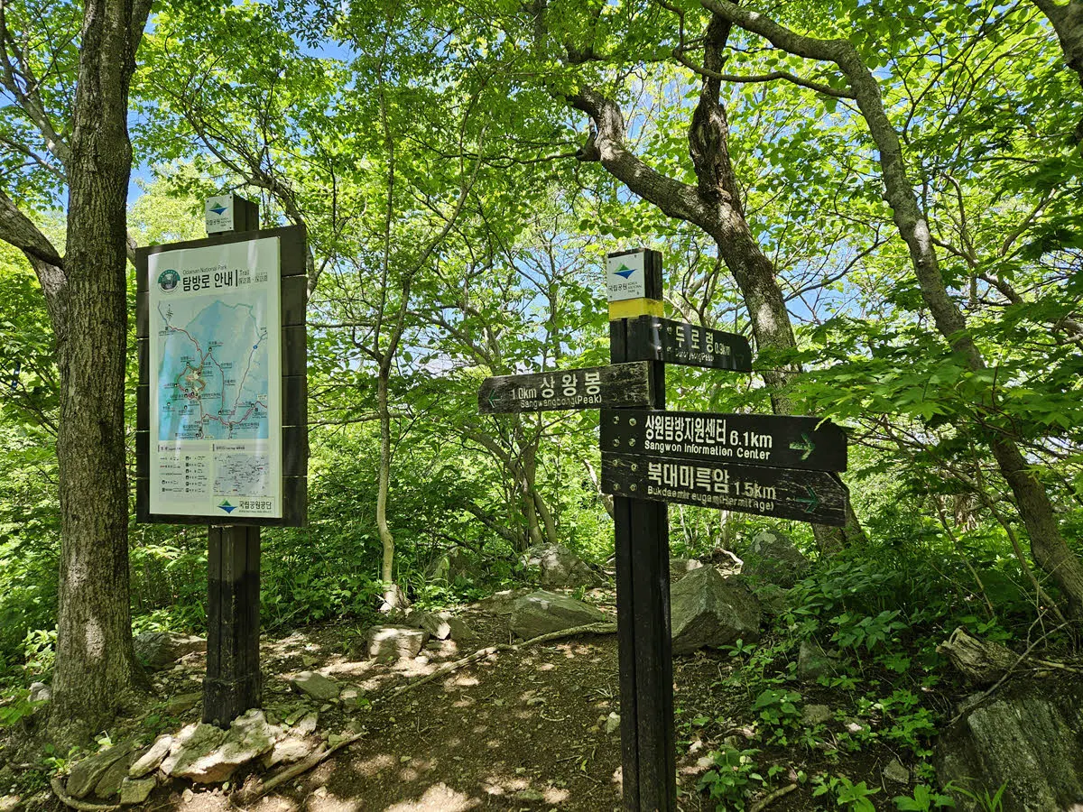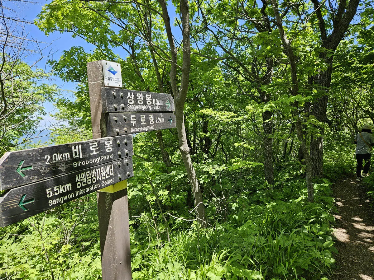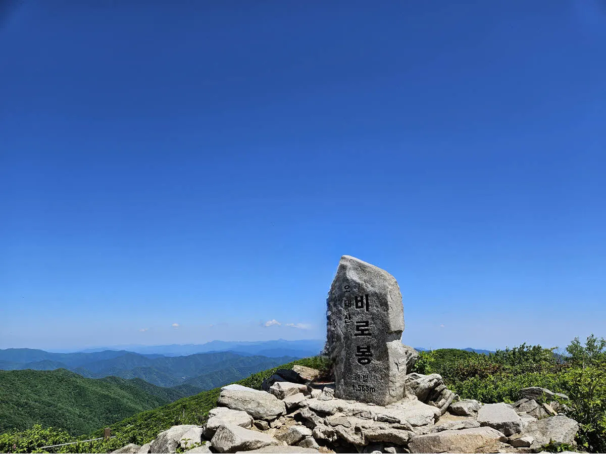 오대산의 최고봉인 비로봉을 포함하는 하이킹 코스는 차로 갈 수 있는 가장 높은 지점인 상원사 주차장에서 출발한다.