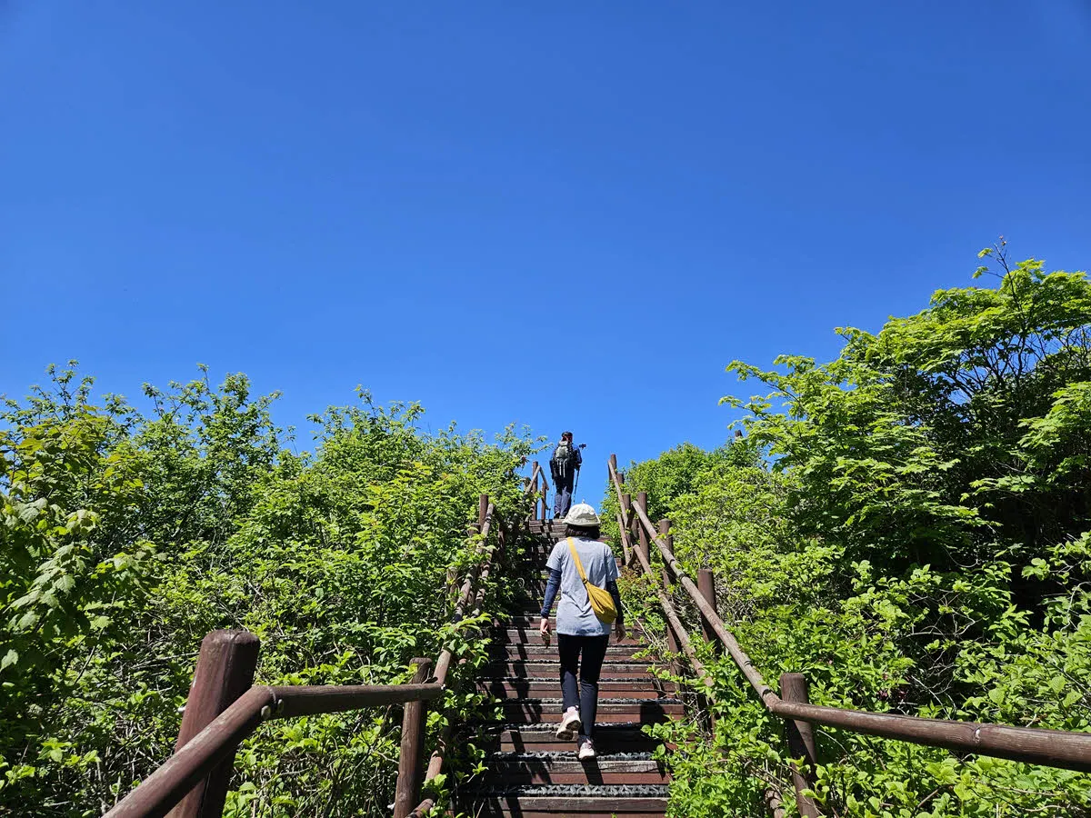 돌계단이 데크 계단으로 바뀌고… 한참을 오르다 보면 갑자기 파란~하늘이 보이며 정상에 다다른다.
