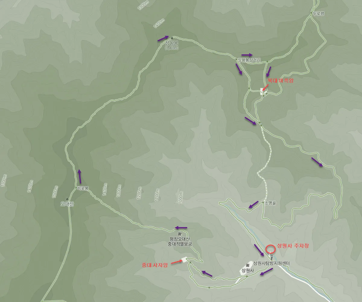 상원사(850m)를 출발하여 중대 사자암과 적멸보궁을 지나 비로봉까지 오른 다음 능선을 타고 상왕봉을 거쳐 상원사로 하산하는 환형 회귀코스다.