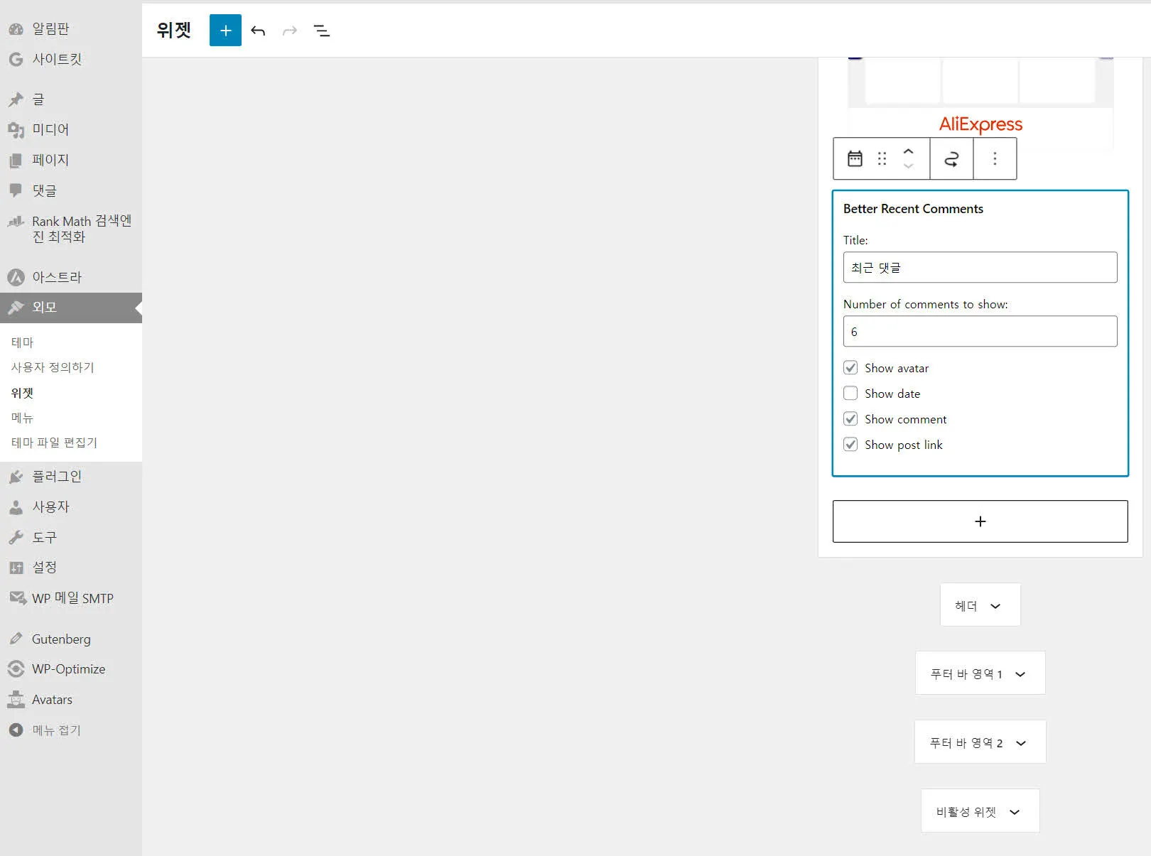 이 플러그인을 설치하면 다음 화면처럼 “외모” 메뉴의 “위젯”에 “Better Recent Comments”라는 위젯이 추가된다.