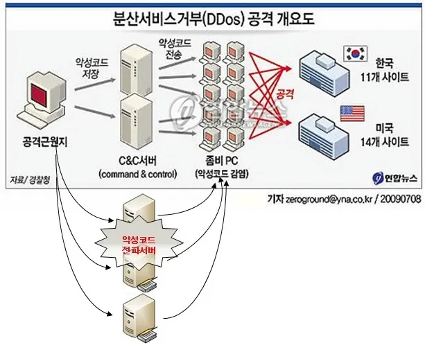 연합뉴스에서 올린 DDOS 공격관련 개념을 설명하는 그림이다. 박스 하단의 “악성코드 전파서버”는 필자가 그려 넣은 그림이다. 실제로 DDoS 공격을 하기 위해서는 해커의 명령에 따라 공격을 수행하는 수많은 좀비PC와 C&C 서버들이 필요하다.