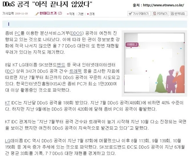 시간 참 빠르게 흘러간다. 7.7 대란 (DDOS공격)이 있었던 지도 벌써 4개월이 지났다. “DDOS 공격”이란 용어가 일반인들 사이에서 이제 점점 잊혀져 가고 있을 그런 시간이 되었다. 그런데 조금 전 웹서핑을 하다가 아직도 DDOS 공격이 계속되고 있다는 기사를 보게 되었다.