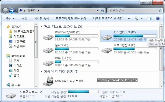“시스템디스크(D:)가 실제로는 C: 로 잡히는 첫번째 파티션이다. 그리고 Windows7_VHD(C:)이 바로 D:에 생성되어 있는(실제로는 C:) 가상 하드 디스크이다.