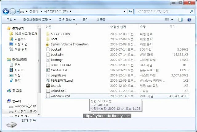 40G짜리 Windows7.vhd 파일이 보이는가? 그것이 바로 C:로 잡힌 가상하드디스크 파일이다.