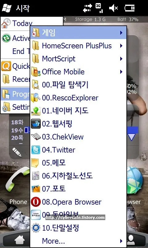윈도 6.5의 벌집 메뉴를 이전 윈모의 시작메뉴스타일로 변경한 화면.