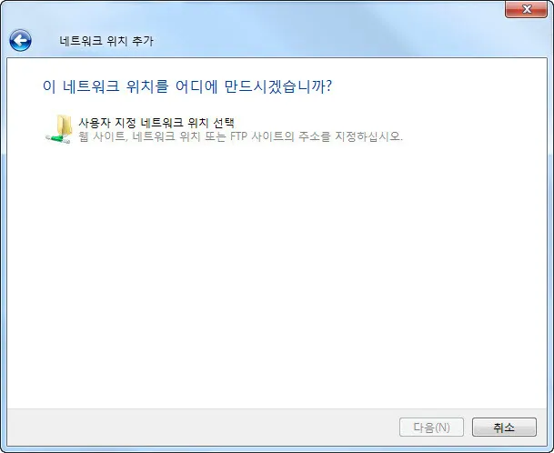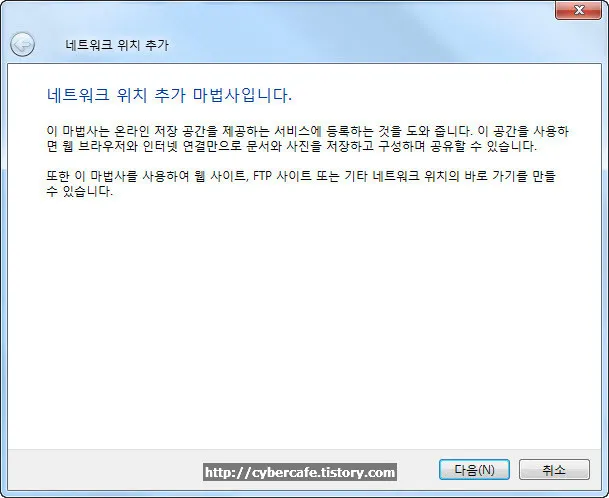 다음 화면처럼 네트워크 위치 추가 마법사가 실행됩니다. 윈도에는 너무도 많은 마법사가 있습니다.