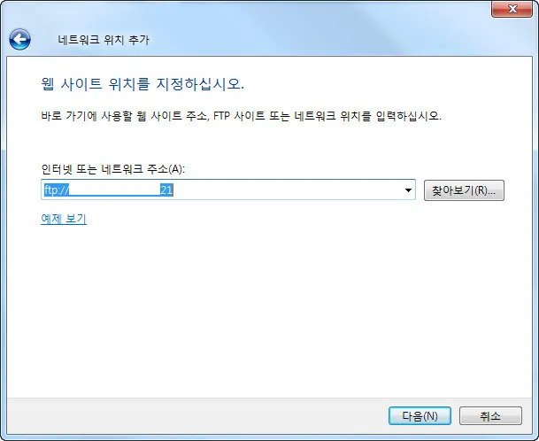 이제 주소를 넣으라고 나옵니다. FTP 사이트이므로 아래 처럼 ftp:// 으로 시작하도록 주소를 넣습니다. 만약 포트가 21번이 아니라면 IP주소:포트번호 와 같이 포트번호를 지정할 수 있습니다.