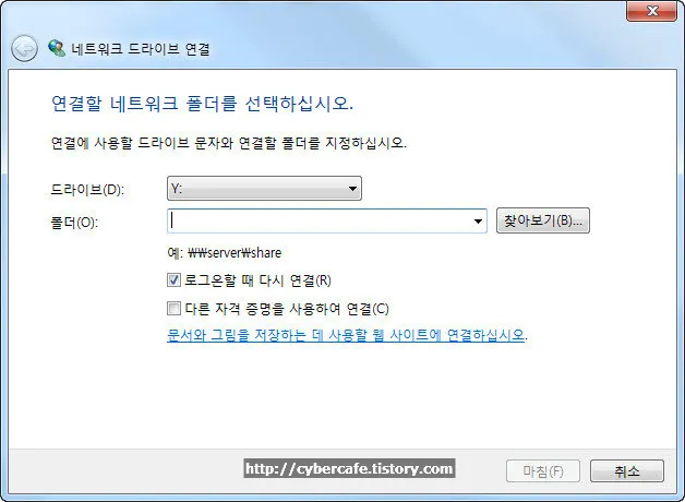 다음은 적절한 드라이브 레이블을 선택하고 맨 아래쪽에 있는 밑줄쫙~~쳐진  “문서와 그림을 저장하는데 사용할 웹사이트에 연결하십시오” 를 선택합니다.