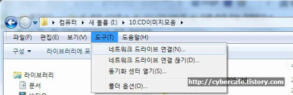 먼저 탐색기의 메뉴에서 아래와 같이 “도구” 메뉴의 “네트워크 드라이브 연결(N)…”을 선택합니다.
