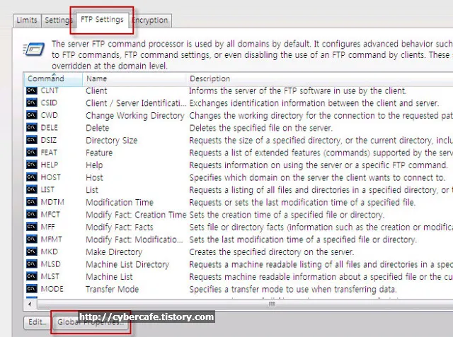 4. “FTP Settings” 탭에서 가장 하단에 있는 “Global Properties…” 버튼을 클릭한다.