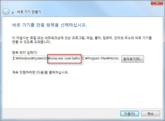 4. 바로 가기 만들기 마법사가 실행된다. “항목 위치 입력”에 아래 처럼 runas.exe 명령에 현재 로그인한 계정 외 새롭게 만든 계정을 /user:새계정명 과 같이 주어 파워포인트를 실행하는 바로가기를 만든다.