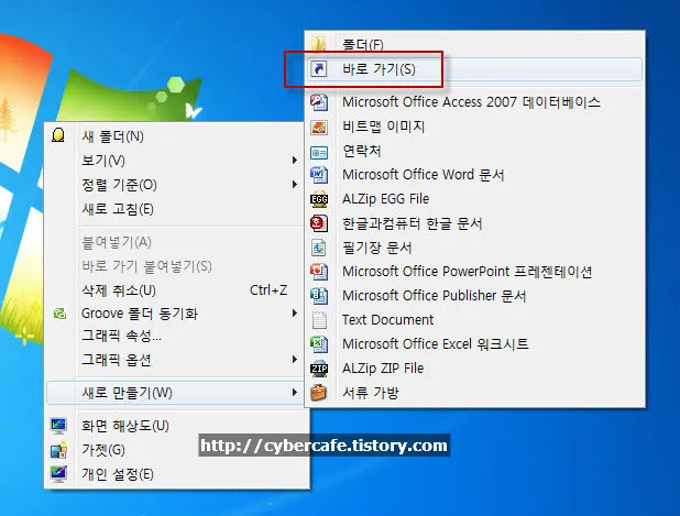 3. 바탕화면에서 아래와 같이 마우스 우클릭하여 “새로만들기” – “바로 가기”를 선택한다.