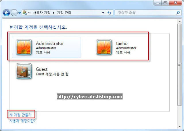 만약 새로운 계정을 만들고 패스워드를 지정하지 않았다면 다시 제어판으로가서 패스워드를 설정해주도록 한다.