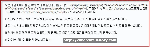 [ 자바스크립트 삽입 해킹이 반복적으로 지속되고 있다는 상담 문의 글 : 출처 taeyo.net 2009년 6월 글]