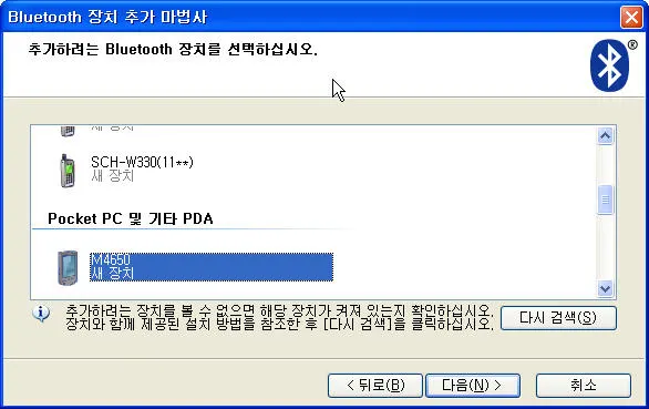 다음과 같이 M4650 장치나 PDA가 검색되어야 한다. 만약 인식이 되지 않는다면 하드웨어적인 설정을 다시 살펴보아야 한다.