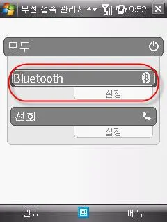 위의 그림과 같이 PDA의 제어판-설정-연결 탭으로 이동하여 무선접속관리자를 실행하면 다음과 같이 전화와 블루투스 장치를 켜고 끌 수 있는 메뉴가 보인다. 이 화면은 M4650 기준이며 다른 PDA의 경우 설정화면은 다를 수 있으나 하드웨어적으로 블루투스와 무선랜 등을 켜고 끌 수 있는 화면이 존재할 것이다. 그 화면으로 이동하여 블루투스 장치를 켜면된다.