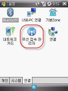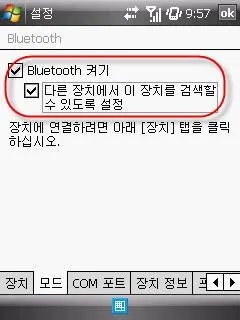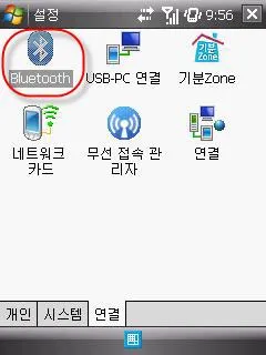 블루투스 장치를 켰다면 이제 PC에서 블루투스 장치를 검색하여 M4650을 인식할 수 있도록 PDA에서 설정을 해주어야 한다. 다음과 같이 연결설정 탭에서 블루투스 장치를 클릭한다.다음과 같이 다른 장치에서 PDA를 검색할 수 있도록 검색 허용 옵션에 체크를 해준다.