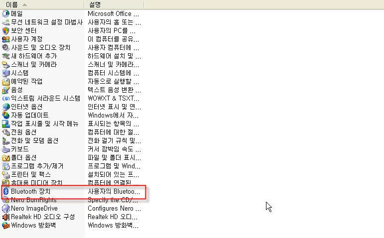 블루투스 장치를 켰다면 이제 PC의 제어판에서 블루투스 설정을 시작한다