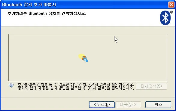 앞에서 실행된 블루투스 장치 추가 마법사에서 “다음” 버튼을 누르면 다음과 같이 켜져있는 노트북의 블루투스 장치를 이용하여 주변에 검색이 허용된 블루투스 장치를 찾게 된다.