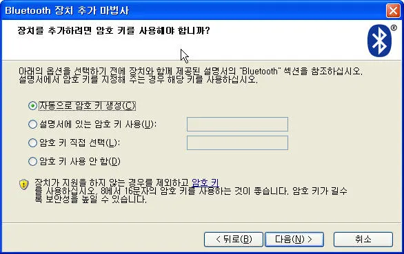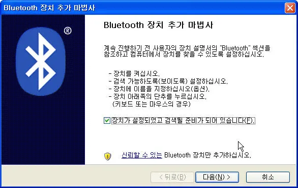 화면과 같이 마법사가 실행되면 아래쪽의 장치 설정 및 검색 준비에도 체크를 해주고 이쯤에서의 블루투스 장치를 켜야한다.