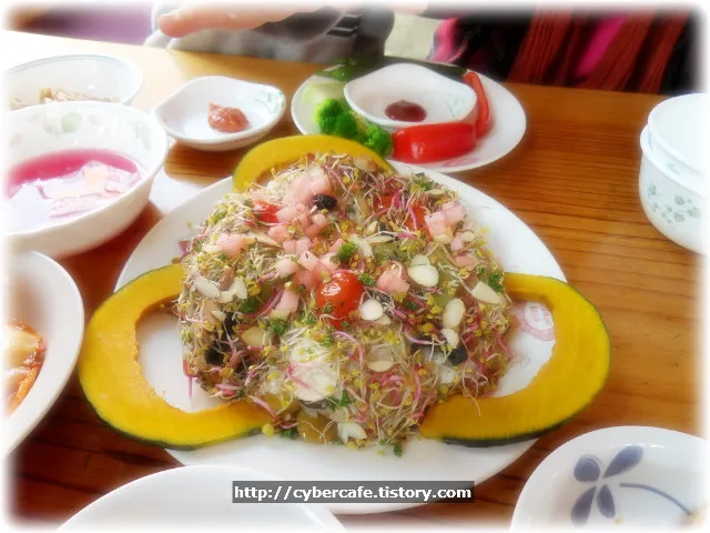 저 밥 아래에는 호박무스가 깔려있다. 근데.. 5년 전보다는 훨씬 양이 적어졌다. 그래도..맛은 좋다. 밥도 찰밥이다. 먹으면 저녁까지..든든하다.
