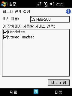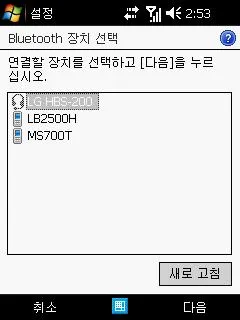여기에는 근방 10M 이내에 있는 상당히 많은 블루투스 장치들이 잡히는 경우가 있다. 다른 장치는 신경쓰지 말고 LG HBS-200 을 선택하고 다음 메뉴를 선택한다.