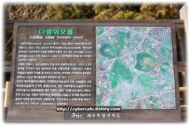 다랑쉬 오름으로 가려면 시멘트로 포장된 길을 가야하는데 대형관광버스는 진입하기에 버거울것 같다. 승용차도 두대가 마주치면 꼼짝없이 한대가 물러나야할 만큼 길이 좁다. 하지만 오름 입구에는 주차장이 있다.