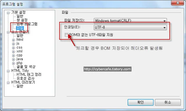“도구 – 프로그램 설정” 메뉴에서 찾아낸 “BOM이 없는 UTF-8 파일 지원” 이라는 체크옵션이 있었다. 그런데 문제는 이 옵션을 체크(V)하고 저장한 뒤 웹서버에 업로드하고 호출해도 같은 오류가 발생한다는 것이다.