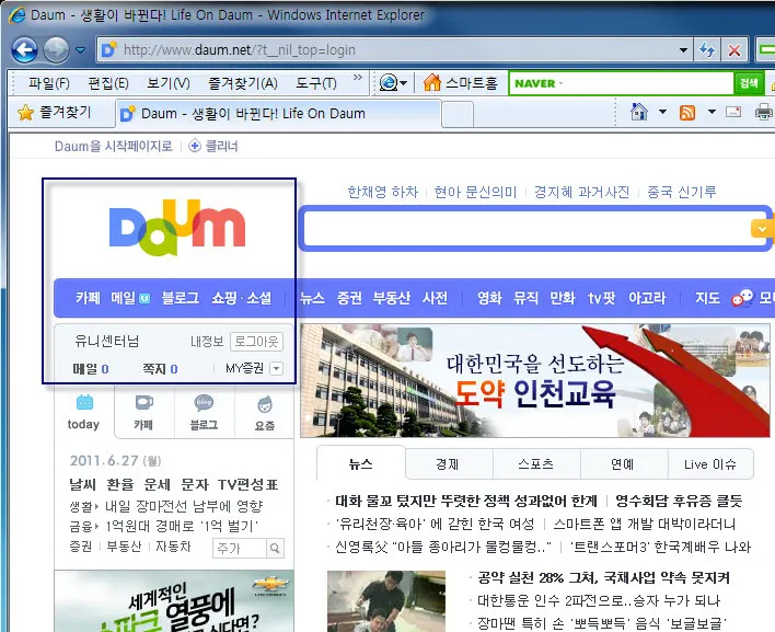티스토리의 계정(이메일주소)와 다음의 계정을 연동하는 과정을 마치고 https://www.daum.net 에서 로그인을 하면 다음과 같이 평소 다음에 로그인한 것과 같은 화면이 보인다.