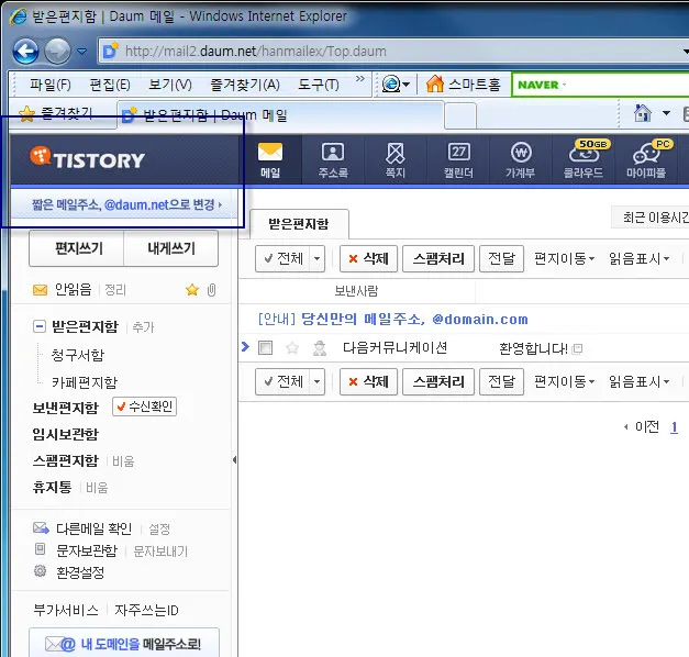 티스토리가 다음에 인수된지 한참만에 tistory.com 으로 되는 메일주소 서비스를 시작하였다. 티스토리에 블로그를 갖고 있는 나로서는 반가운 소식이긴 하다. 주로 사용하는 다른 메일주소가 있긴 하지만 메인블로그가 있는 Tistory의 메일주소를 준다니 반갑긴 하다.