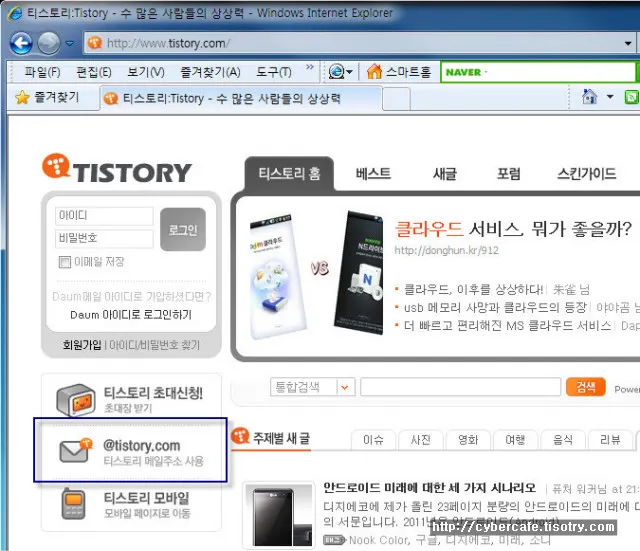 티스토리의 메인페이지에 가면 @tistory.com 의 메일주소를 준다는 것을 대대적으로 광고(?) 하고 있다.