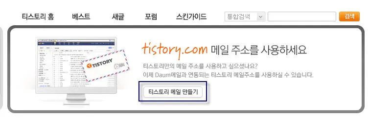 티스토리의 메일주소를 만들기 위해서는 다음(daum.net 혹은 hanmail.net)의 메일주소를 갖고 있어야 하며 티스토리에도 로그인계정을 갖고 있어야 한다.