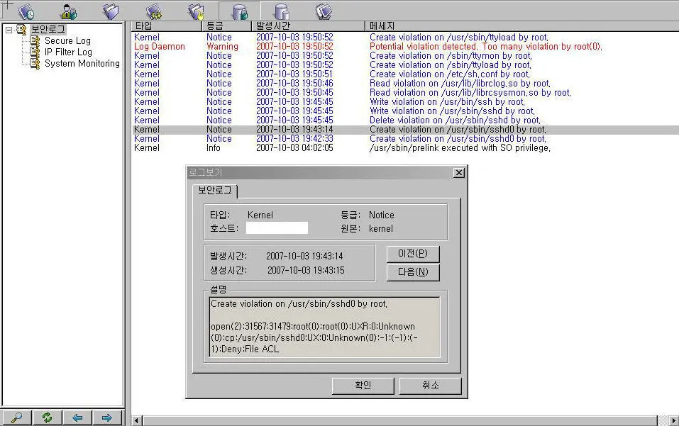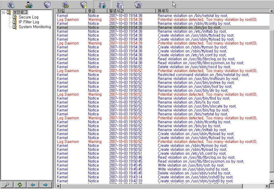 하지만 해커가 root 계정에서 실행한 이 cp명령은 RedCastle 운영체제 바이너리 보호 정책에 의해 거부되었고 위의 화면과 같은 정책 위반 감사 로그를 남겼다. 이후 해커는 root 계정에서 실행한 cp 명령이 실행되지 않자 이해가 되지 않았는지 /usr/sbin으로 이동하여 rm 명령(Delete violation 발생)을 직접 수행해보고 이마저도 차단되자 미친듯이(?) /usr/sbin의 다른 명령어들을 덮어쓰고자 시도하여 무수히 많은 보안 위반 감사 로그를 다음 화면과 같이 남겼다.