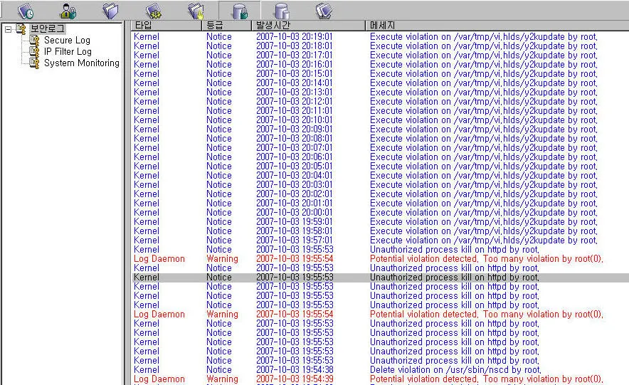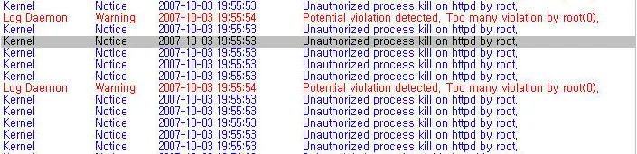 이후 이 해커는 화가 났는지 ps 명령어를 통해 httpd 대몬이 실행중인 웹서버임을 확인하고 httpd를 kill 시켰다. (이 웹서버의 Kill은 Warning 모드로 설정되어 있어 차단하지는 않고 감사기록만 남기도록 했었다.)