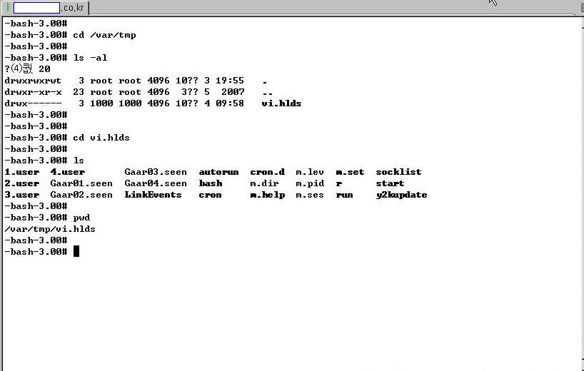 이후 해커는 이 서버를 거점으로 다른 서버를 공격하려 한것으로 보인다. 해커는 /var/tmp/vi.hlds라는 디렉토리를 생성하고 다음과 같이 외부의 다른 서버를 공격하는 공격도구를 설치하였다.